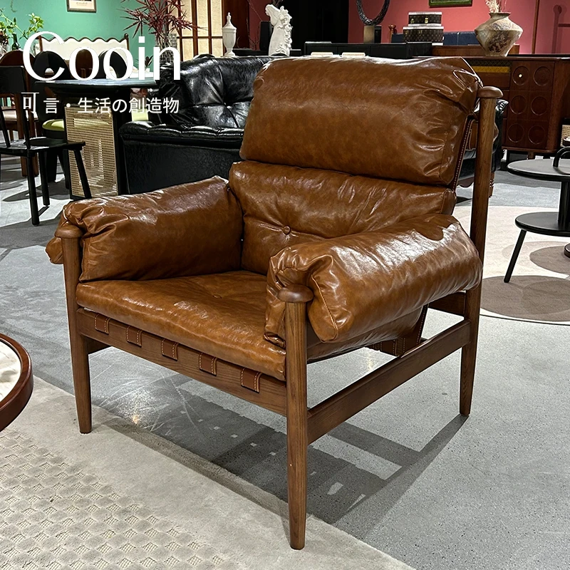 北欧スタイルの無垢材使用、モダンでシンプルな本革一人掛けソファチェア。くつろぎの空間を演出する侘び寂びデザイン。ホテルやリビングに最適で、洗練されたスタイルが魅力的です。