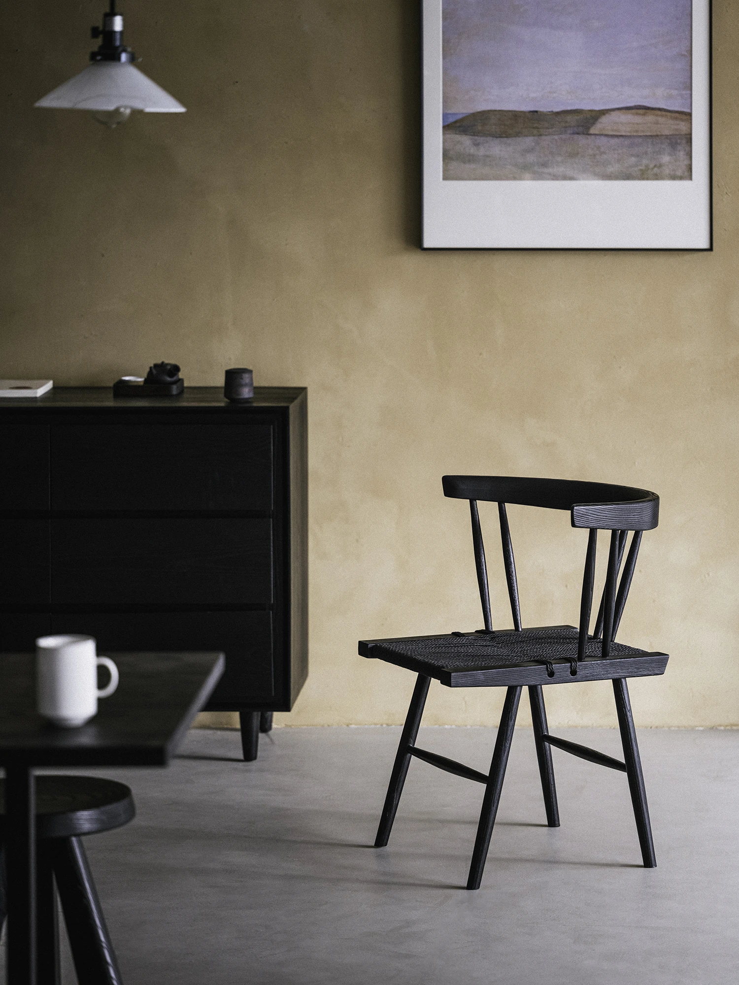 聚屋鳥のホワイトアッシュ製の草座椅子、中島ジョージ椅子。スタイリッシュなホワイトアッシュとブラックストリング編みのデザイン、リラックスできる背もたれ付き。お茶を楽しむのに最適なダイニングチェア。