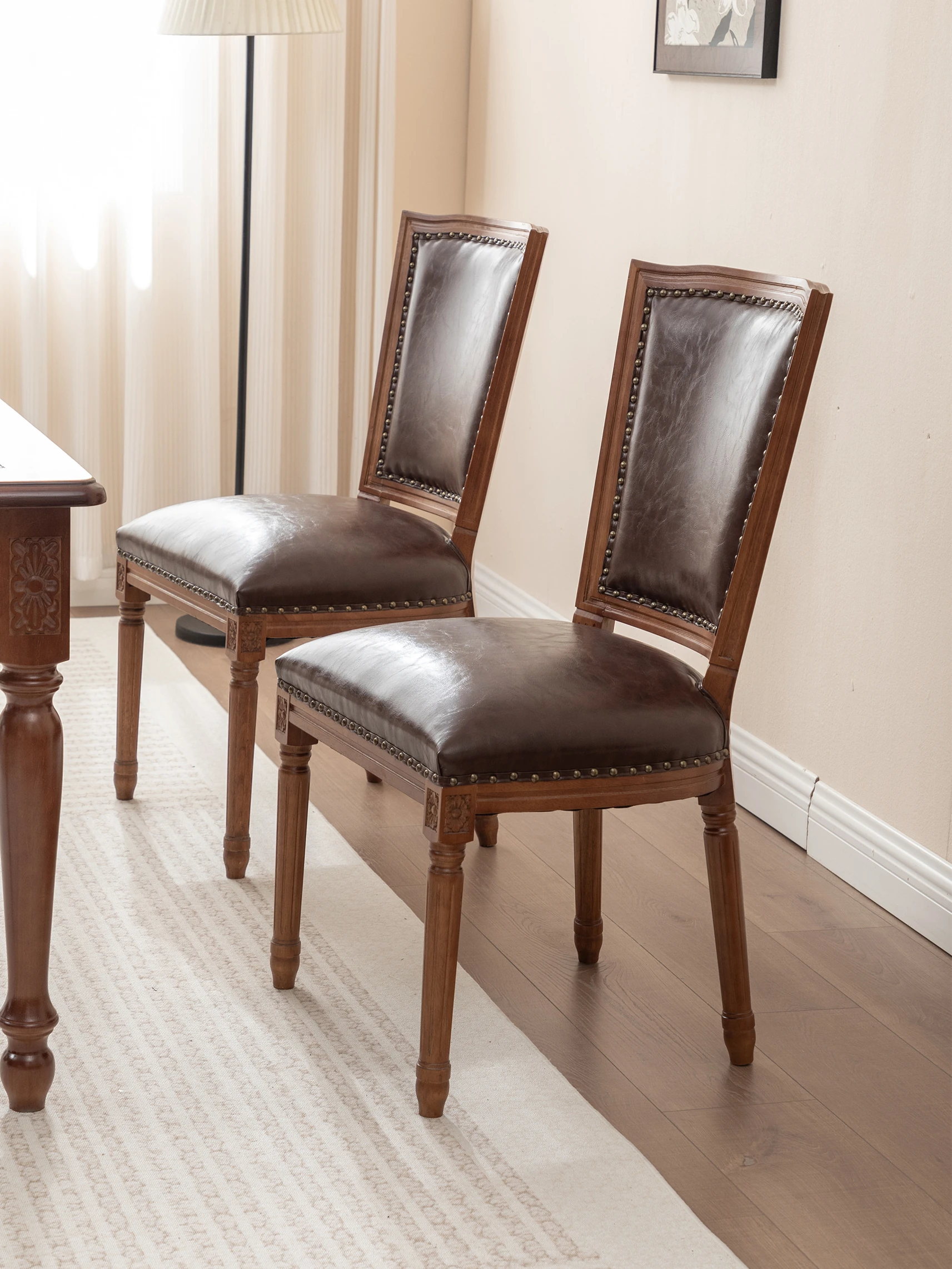 アメリカンスタイルのヴィンテージダイニングチェア|高級感漂う本革&無垢材使用|家庭、ホテル、カフェ、レストラン、クラブに最適な一品!快適な座り心地で、食事のひとときを特別に演出します。