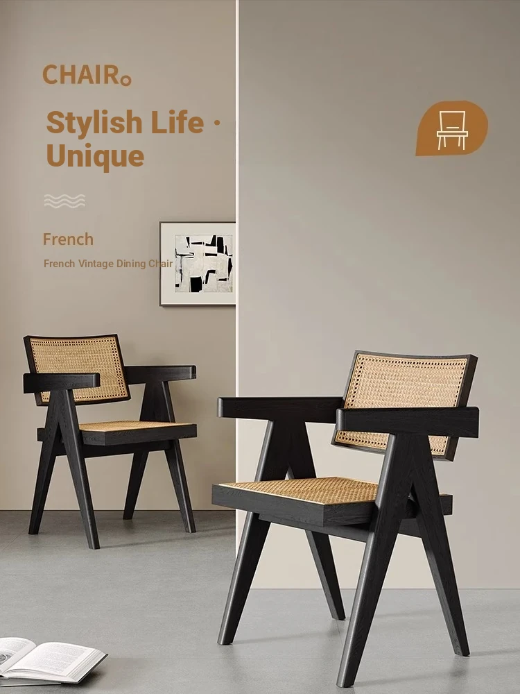 Vintage Solid Wood Dining Chair - Nordic Retro Art Design with Rattan Seat, Ash Wood Armrest and Backrest, Perfect for Home Use