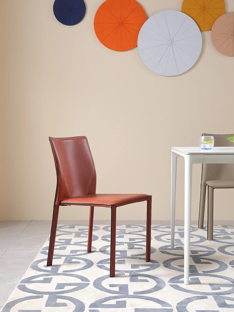 Italian Nordic Style Saddle Leather Dining Chair - Modern Minimalist Backrest Chair for Home Dining Room, Simplistic Designer Desk Stool