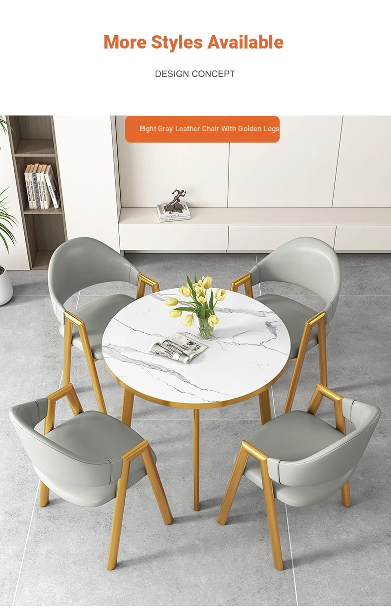 80 Round Table +4 light gray Leather Chair-Gold Feet