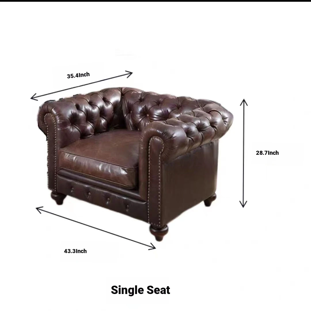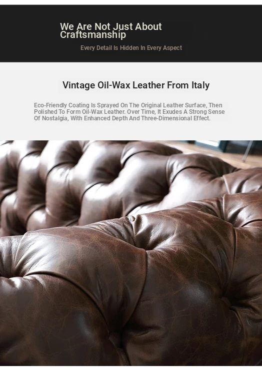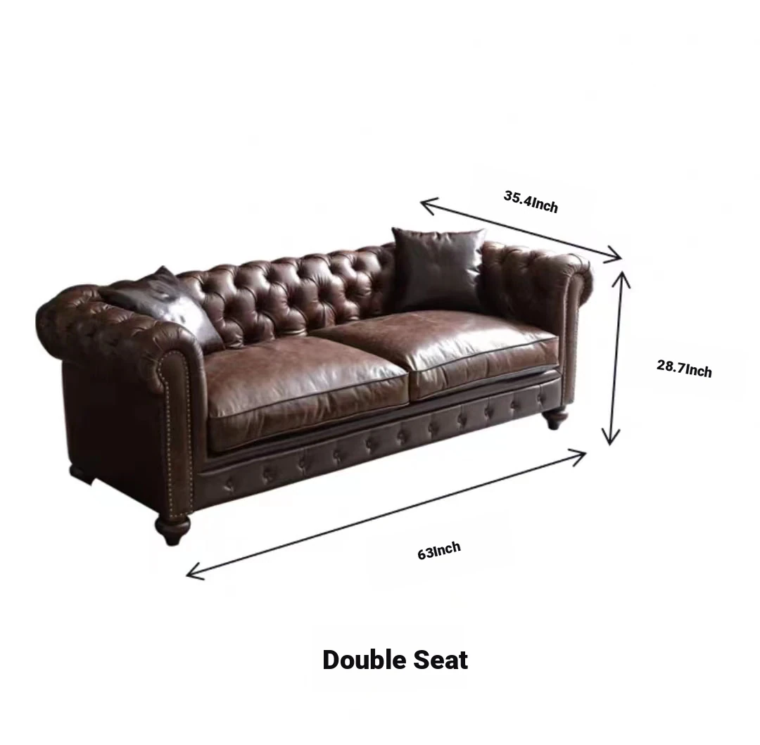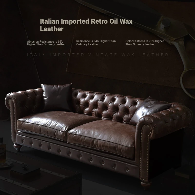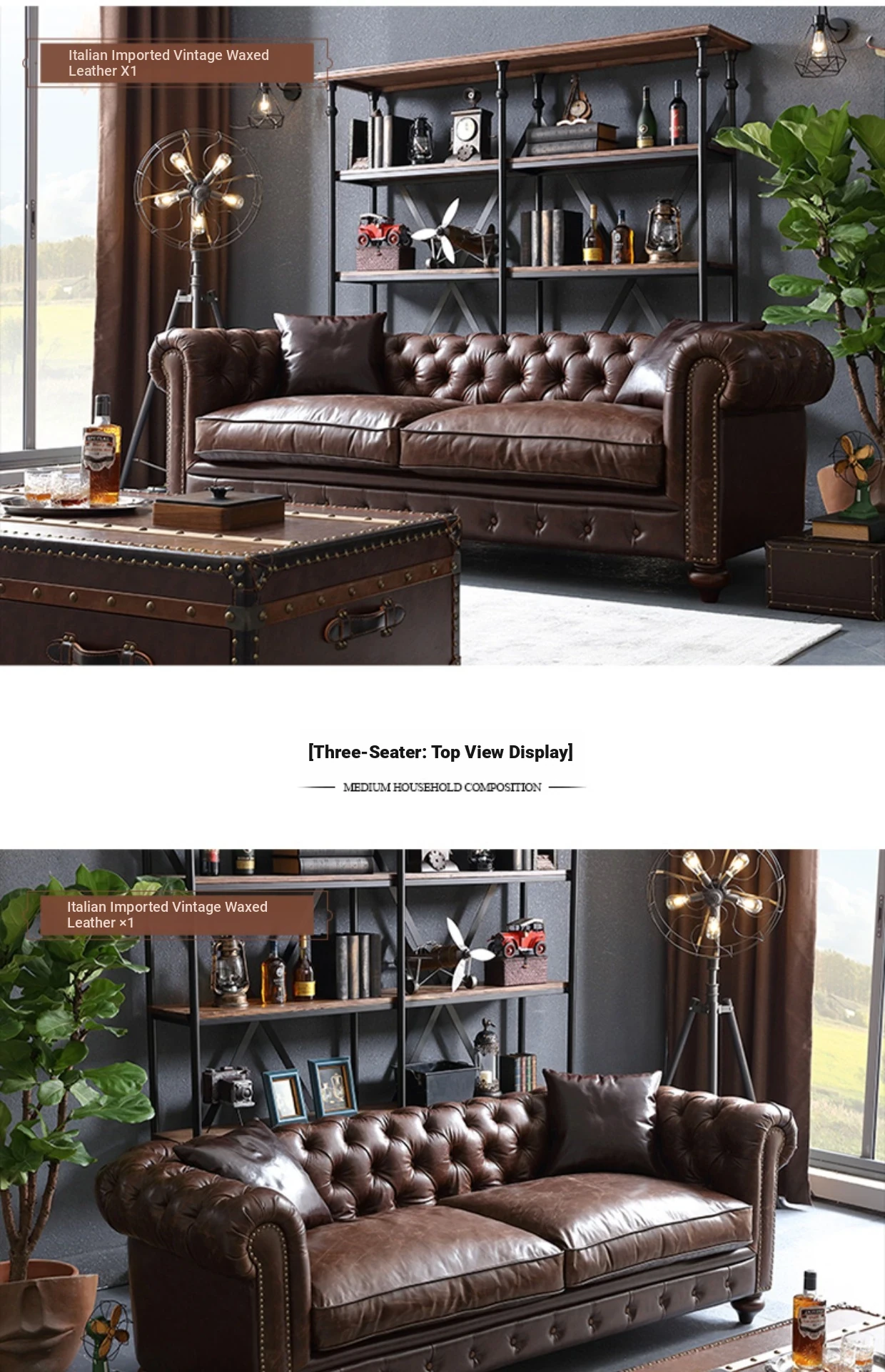 Vintage American Style Three-Seater Sofa with Retro Finish, Industrial Chic Waxed Leather, Genuine Top Grain Cowhide for Stylish Living Room