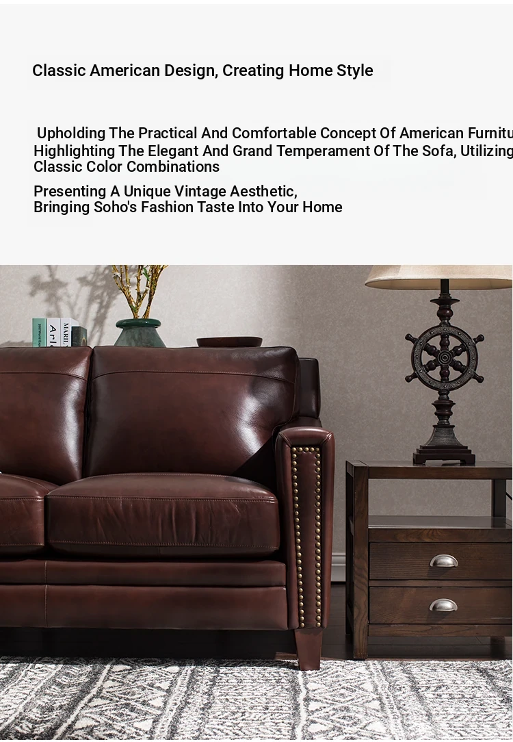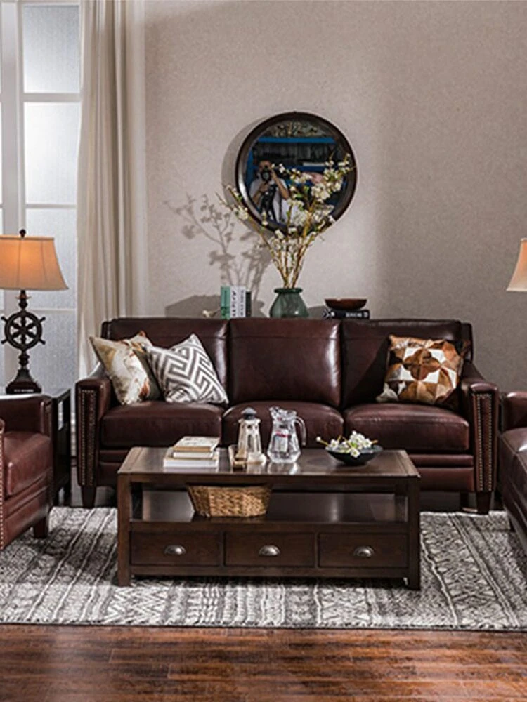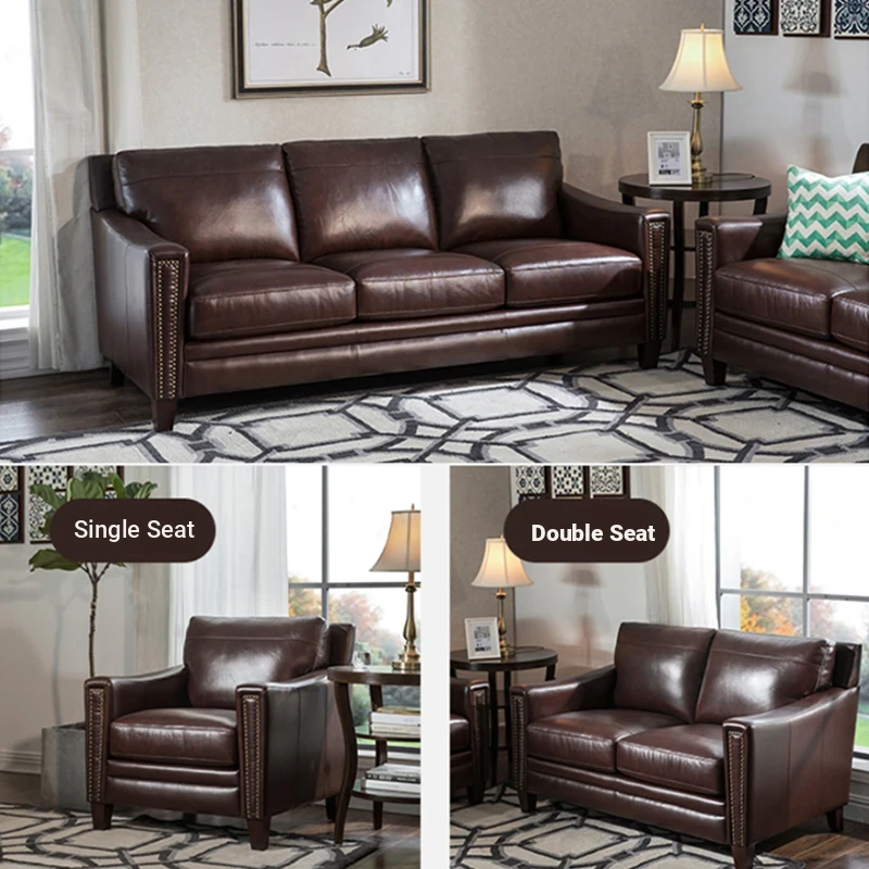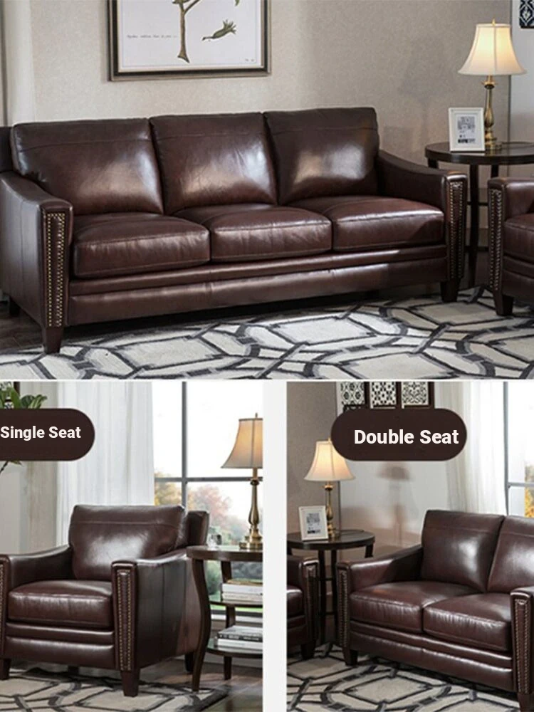 American Genuine Leather Sofa for Small Living Rooms - Complete Set of Vintage European Style Furniture, Double 3-Seater Leather Sofa, Perfect for Cozy Spaces!