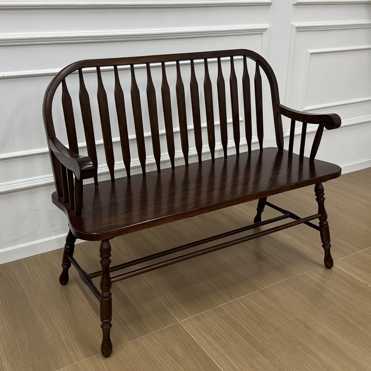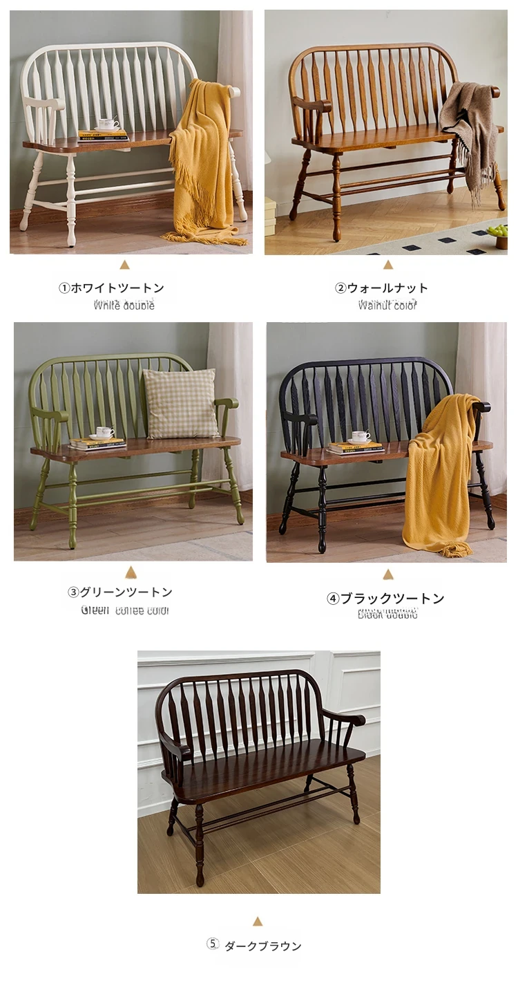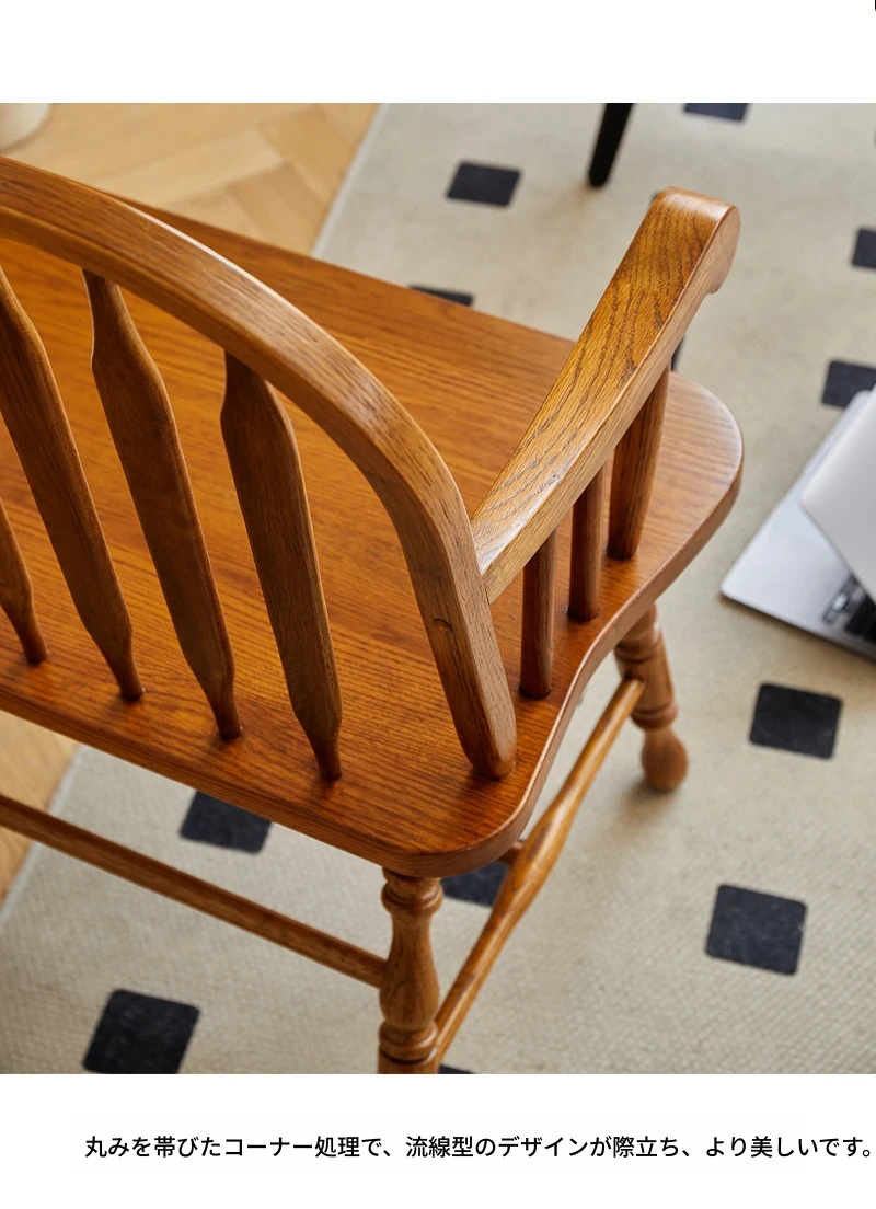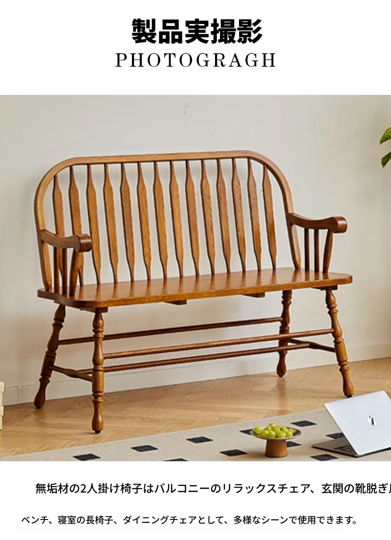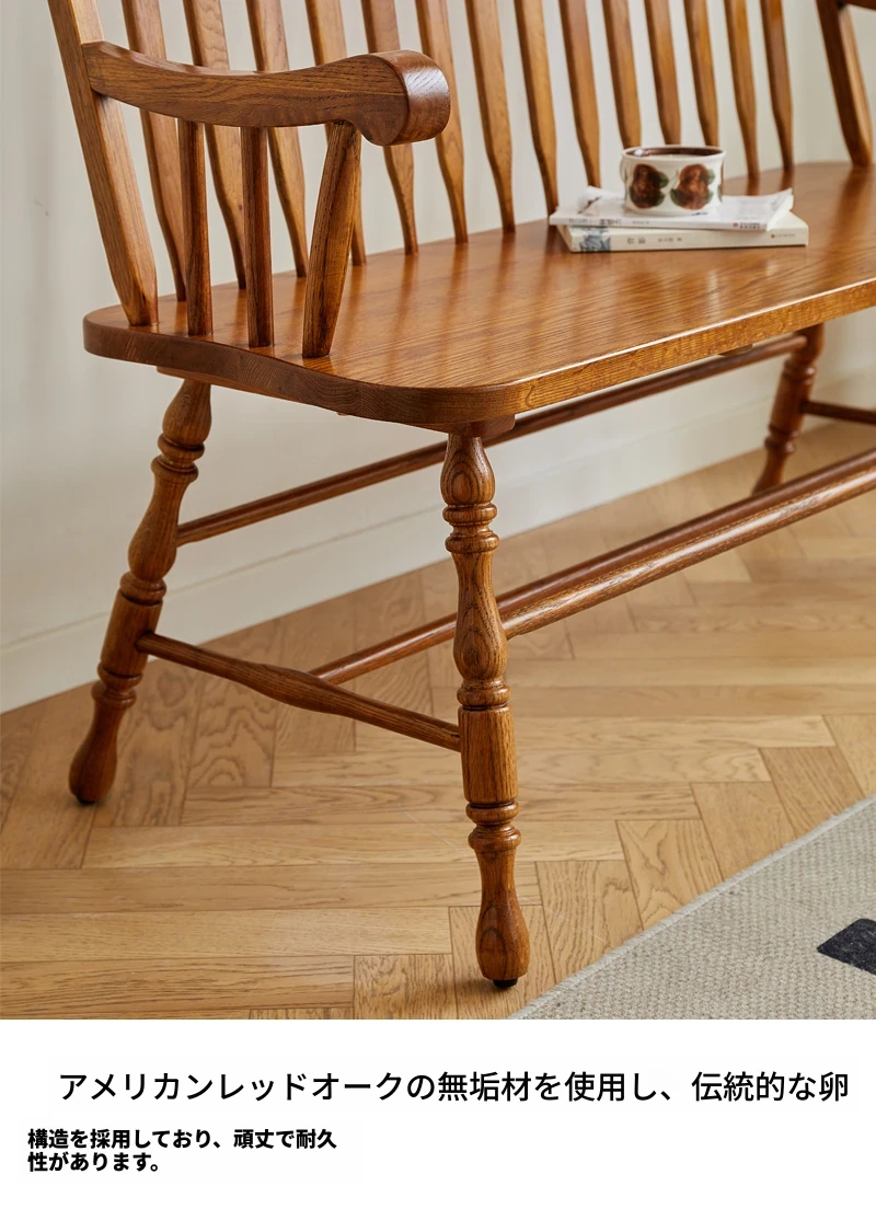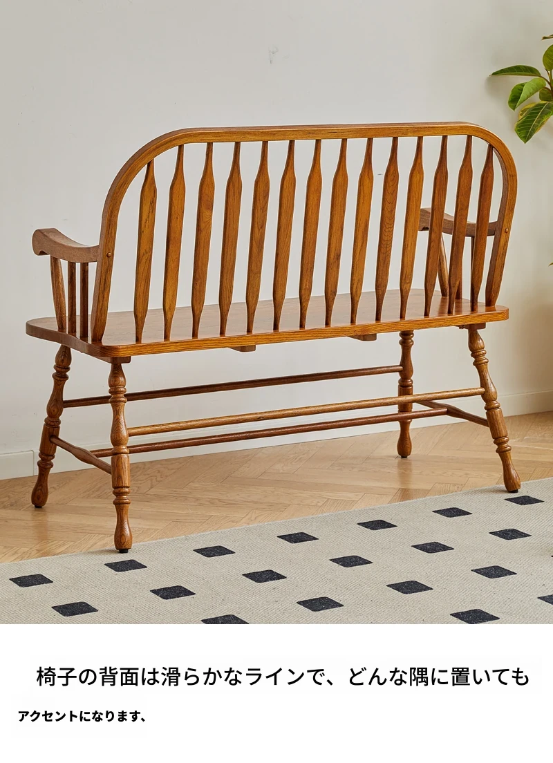 アメリカンスタイルの無垢材使用!快適なアームレスト付きの背もたれ椅子。ダイニングチェア、ベンチ、シューズベンチとしても最適!レトロなデザインで、あなたのお部屋に温もりをプラスします。