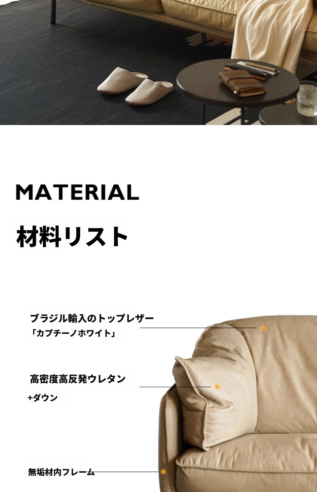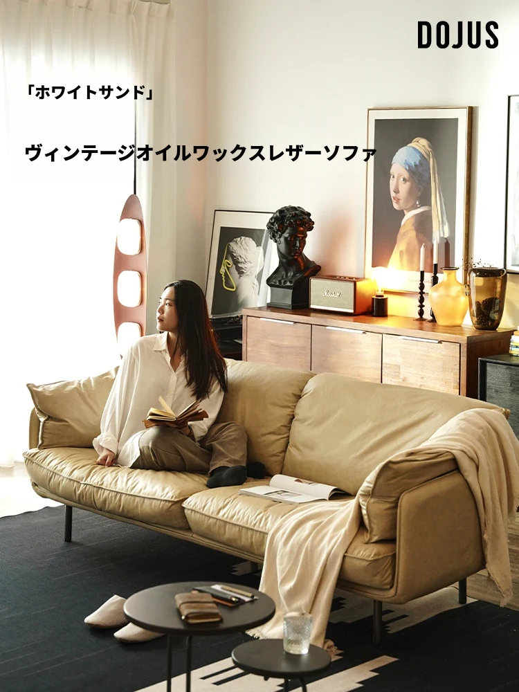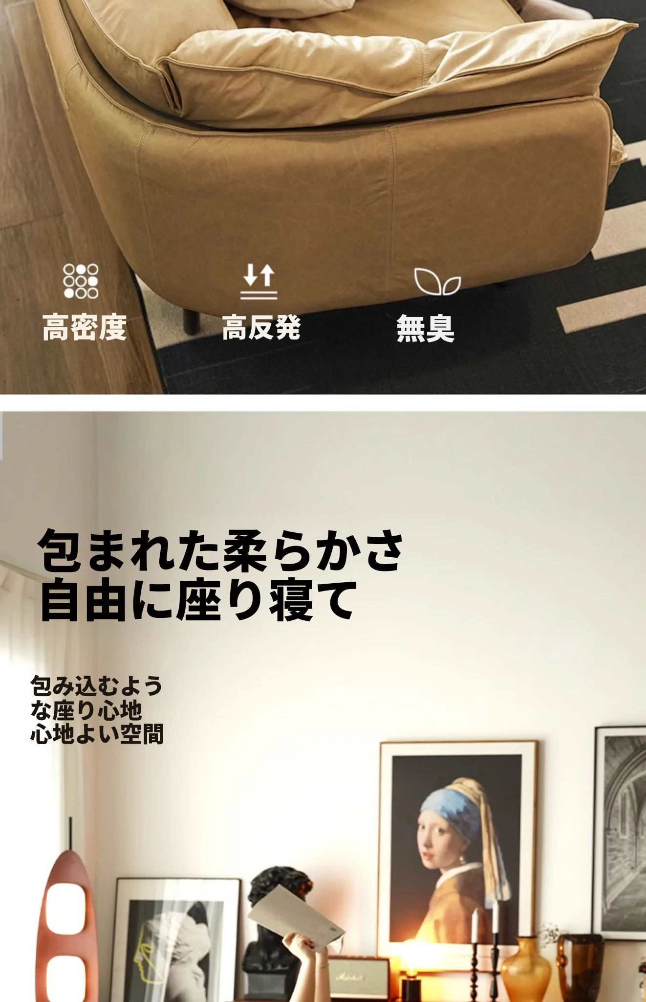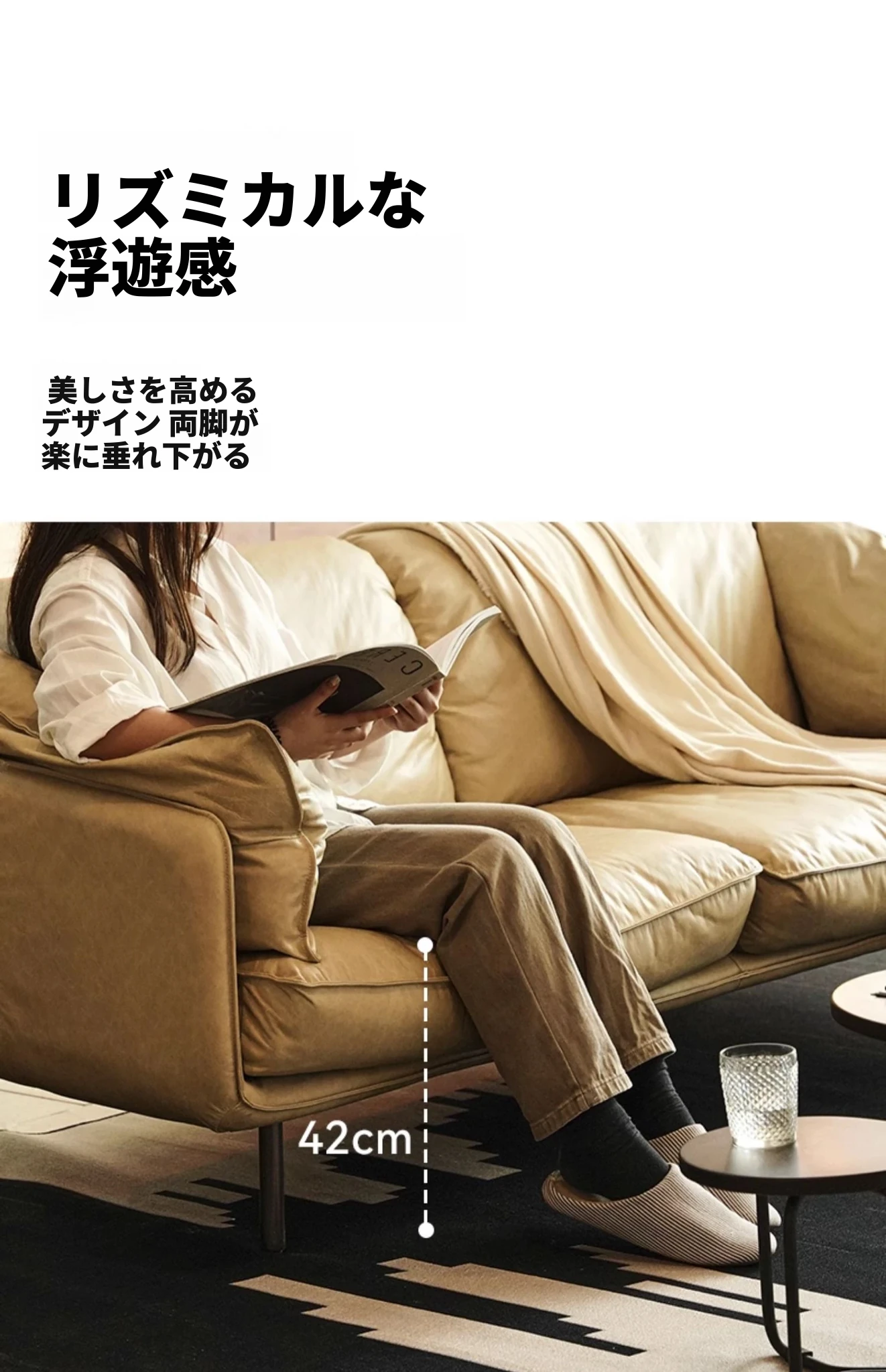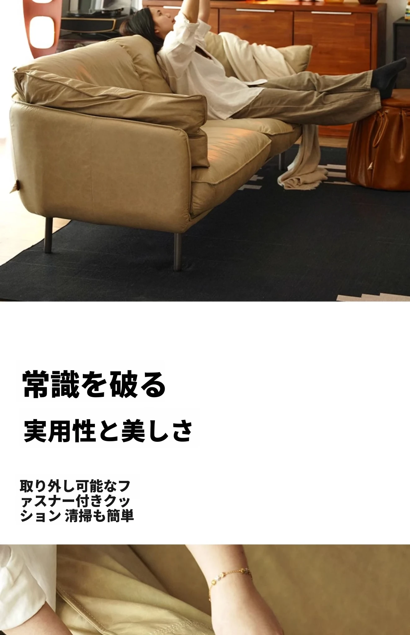 DOJUSリゾートスタイル本革ソファ 小型住宅向け 高級トップグレイン牛革&ダウンクッション 北欧風リビング用3人掛けソファで、快適さとスタイルを両立!