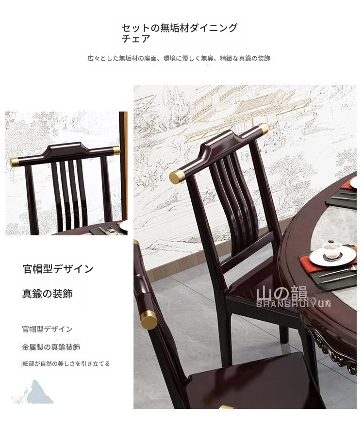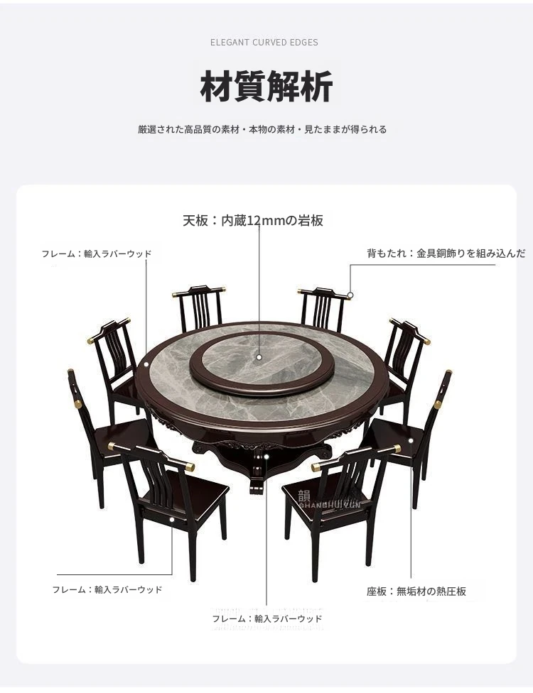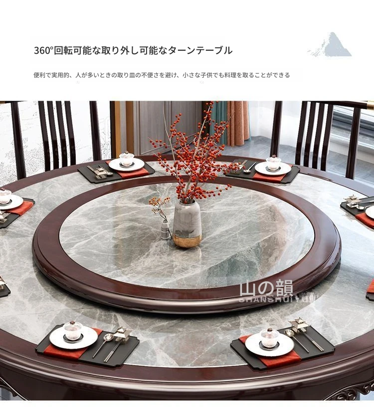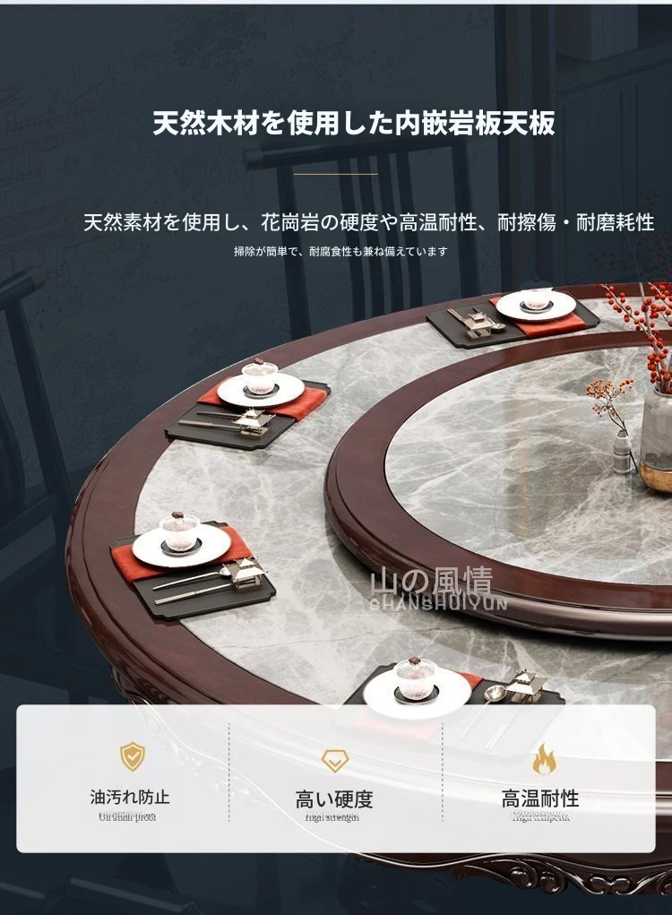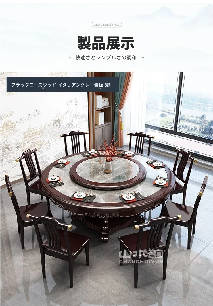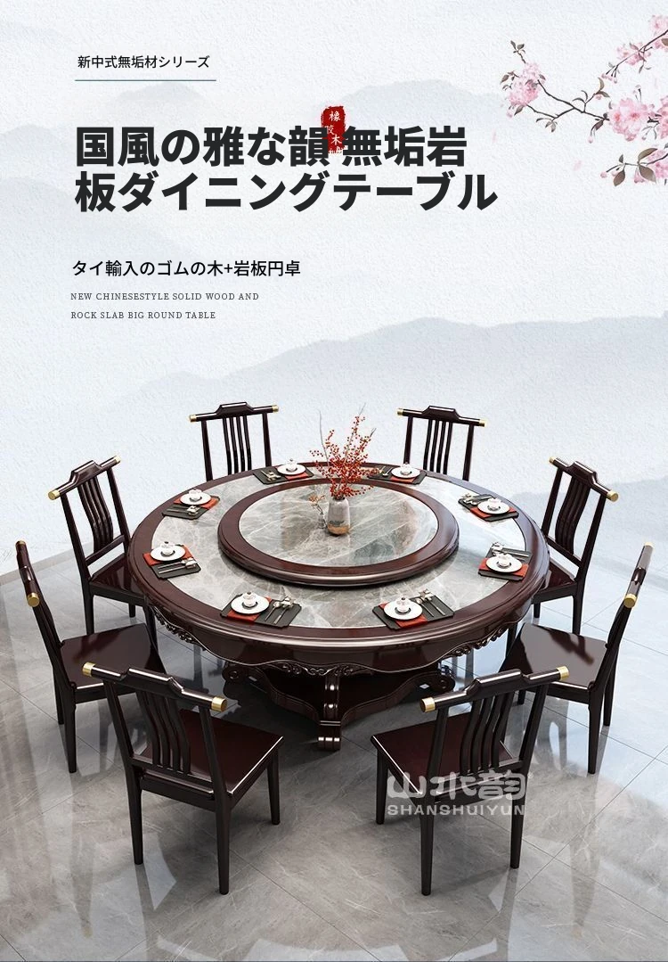 新中式スタイルの高級岩板ダイニングテーブル&チェアセット - 家庭用・実木製・円形回転テーブル・ホテル向け・電磁調理器対応全セットで、上質な食空間を演出します!