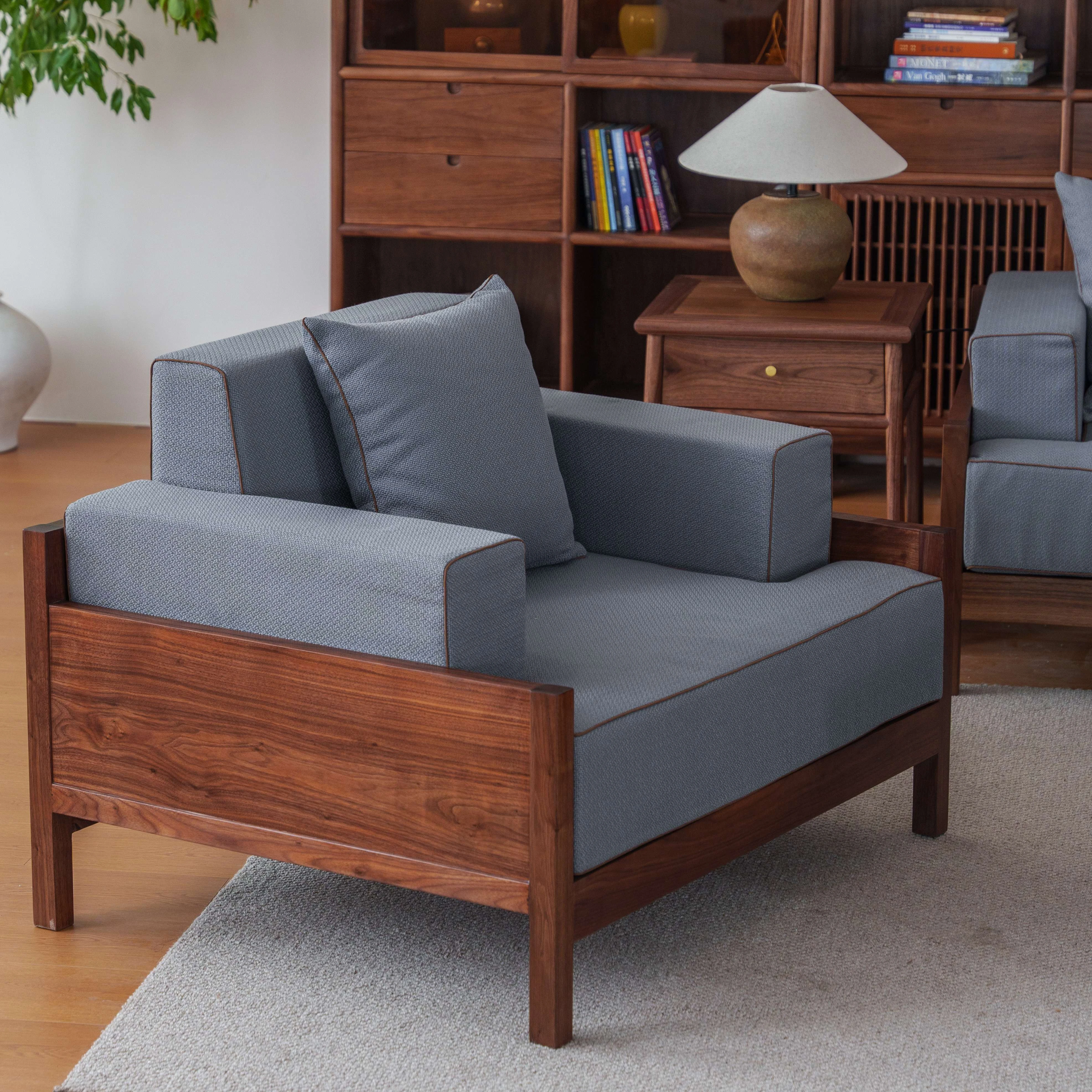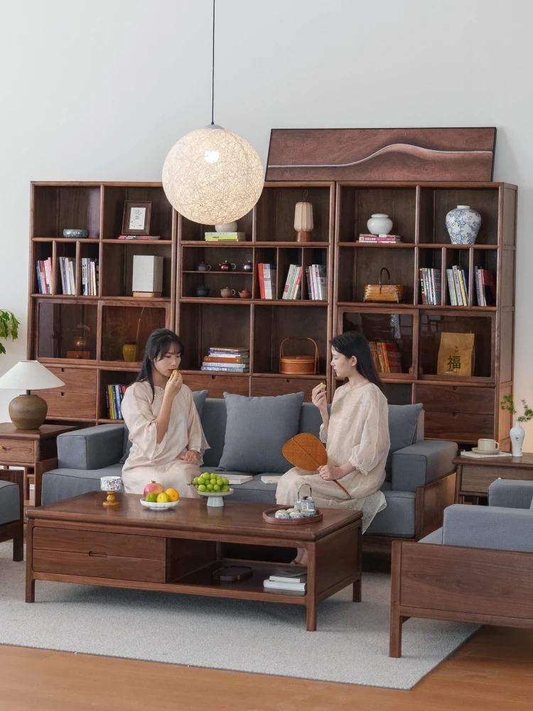 新しい中式スタイルの無垢材ソファと布張りのリビングテーブルセット - 北米産ブラックウォールナットと老榆木を使用したシンプルで洗練されたデザインで、居心地の良いリビング空間を演出します。