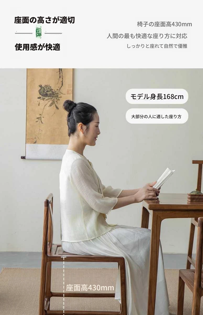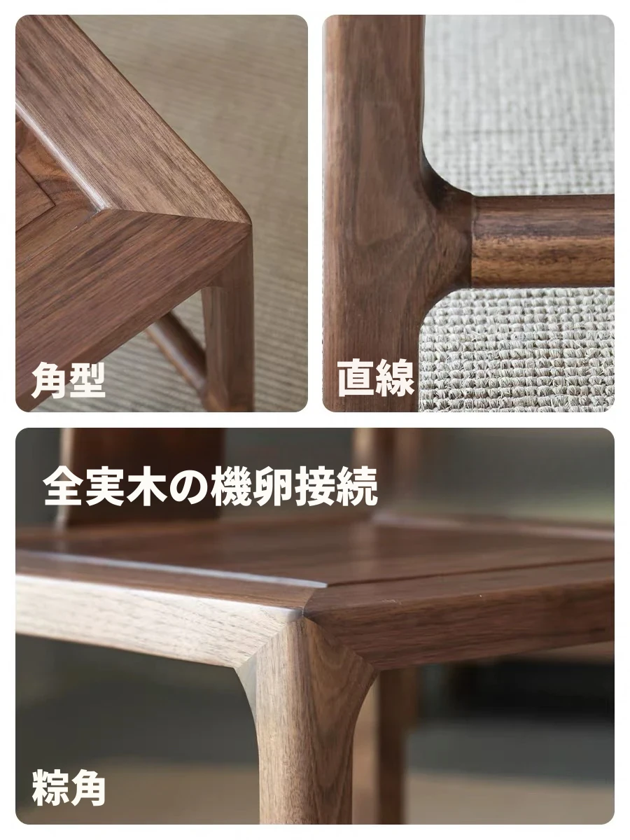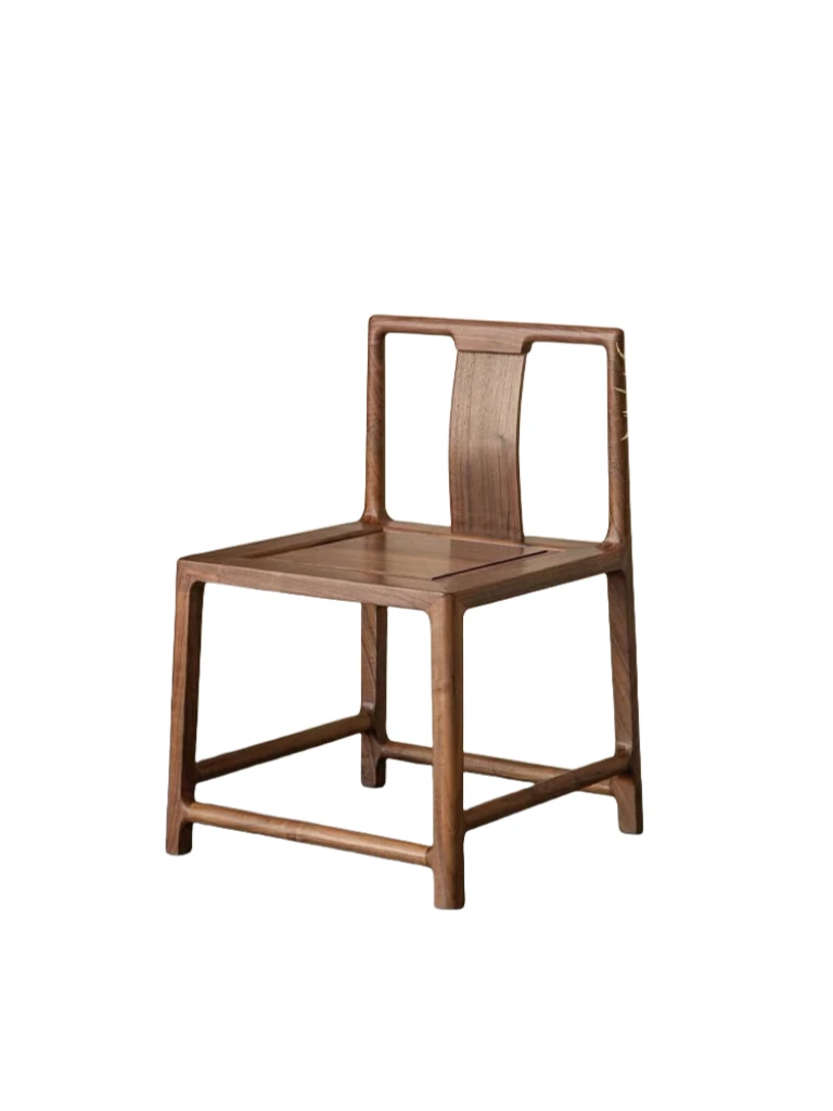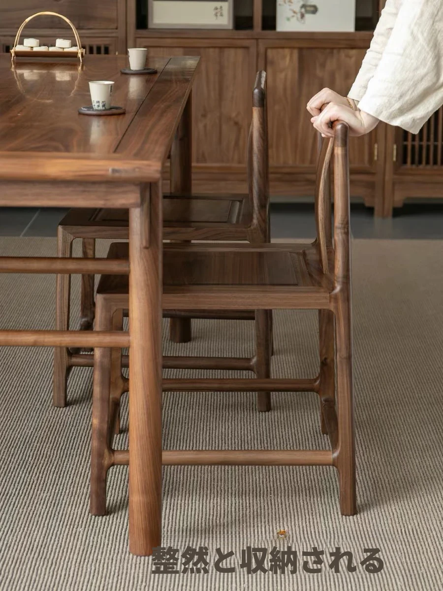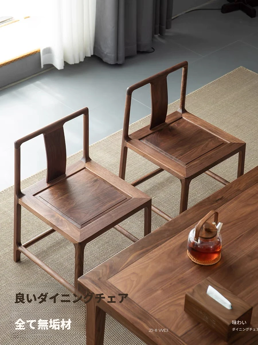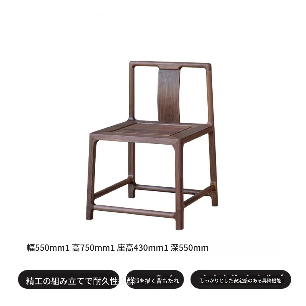 新中式デザインの黒胡桃無垢材を使用したダイニングチェア。優雅なカウホーンスタイルの背もたれ付き、家庭でのリラックスタイムやお茶のひとときにぴったり。高品質な素材で、長くご愛用いただけます。