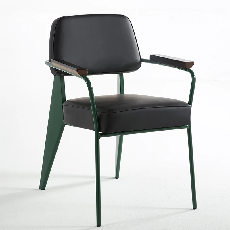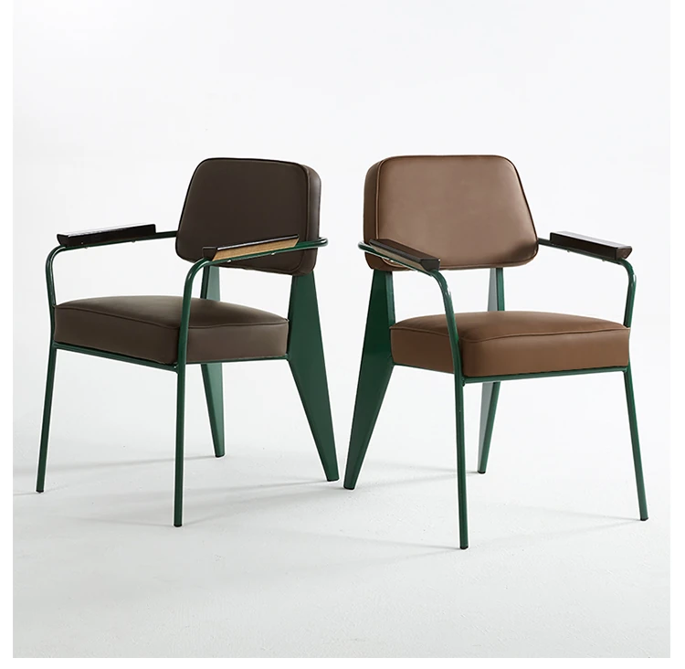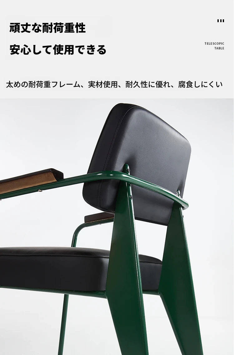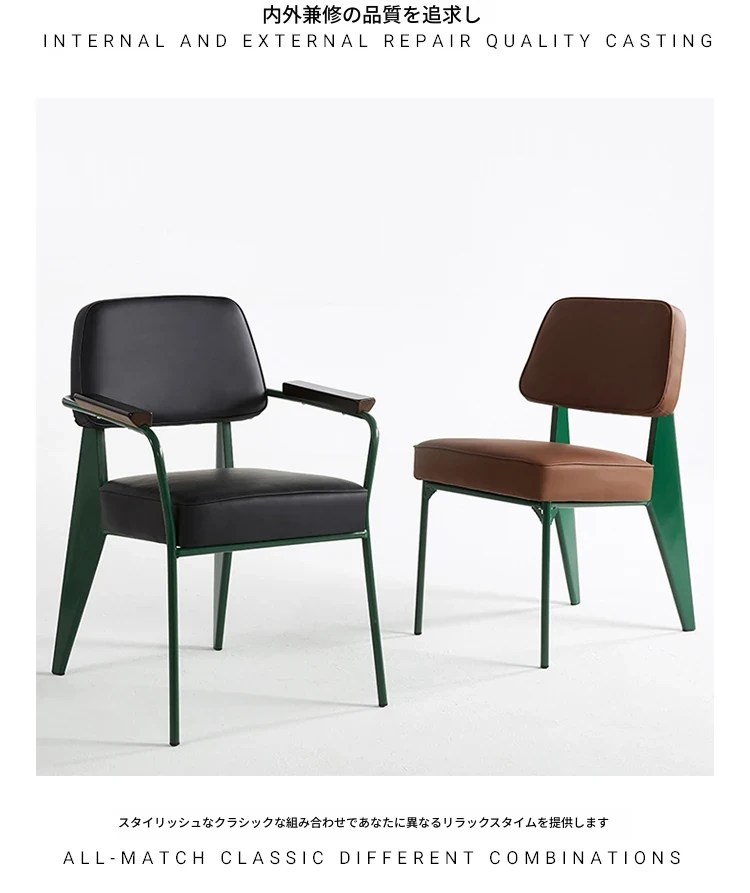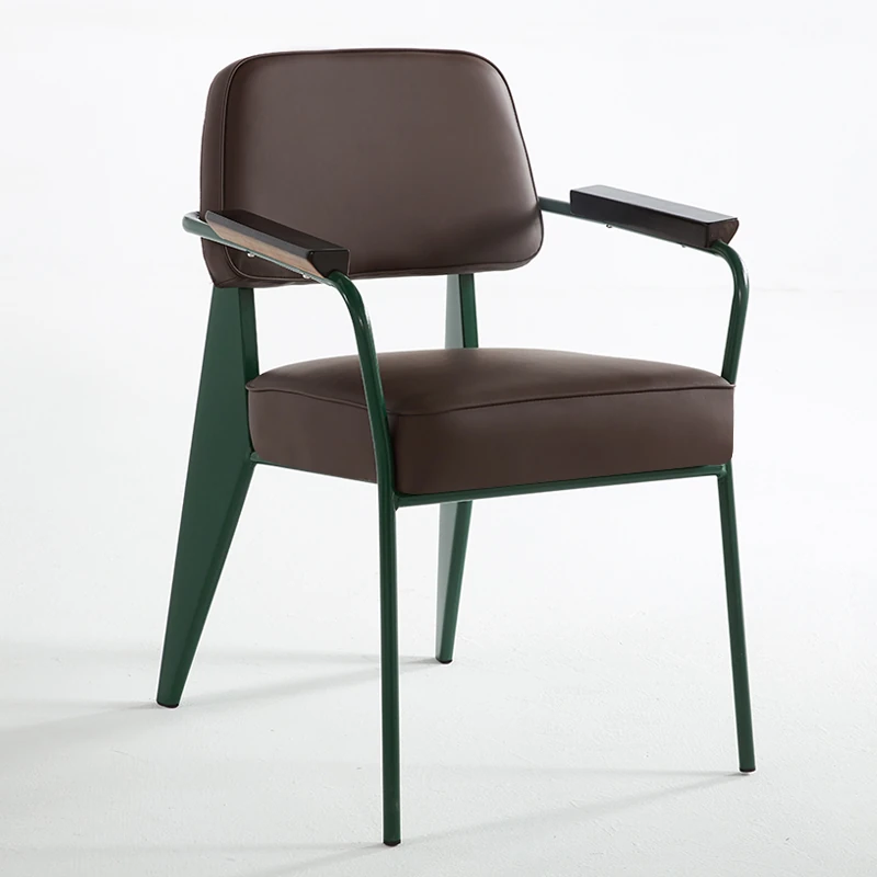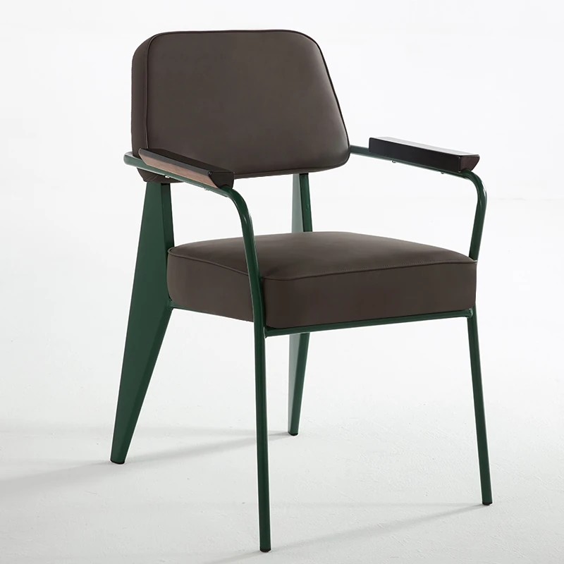 カーキ色の脚にアームレスト付きのダークブラウン面