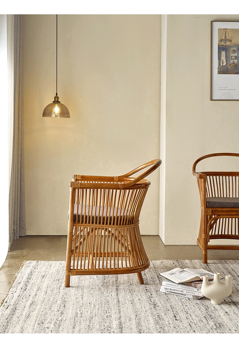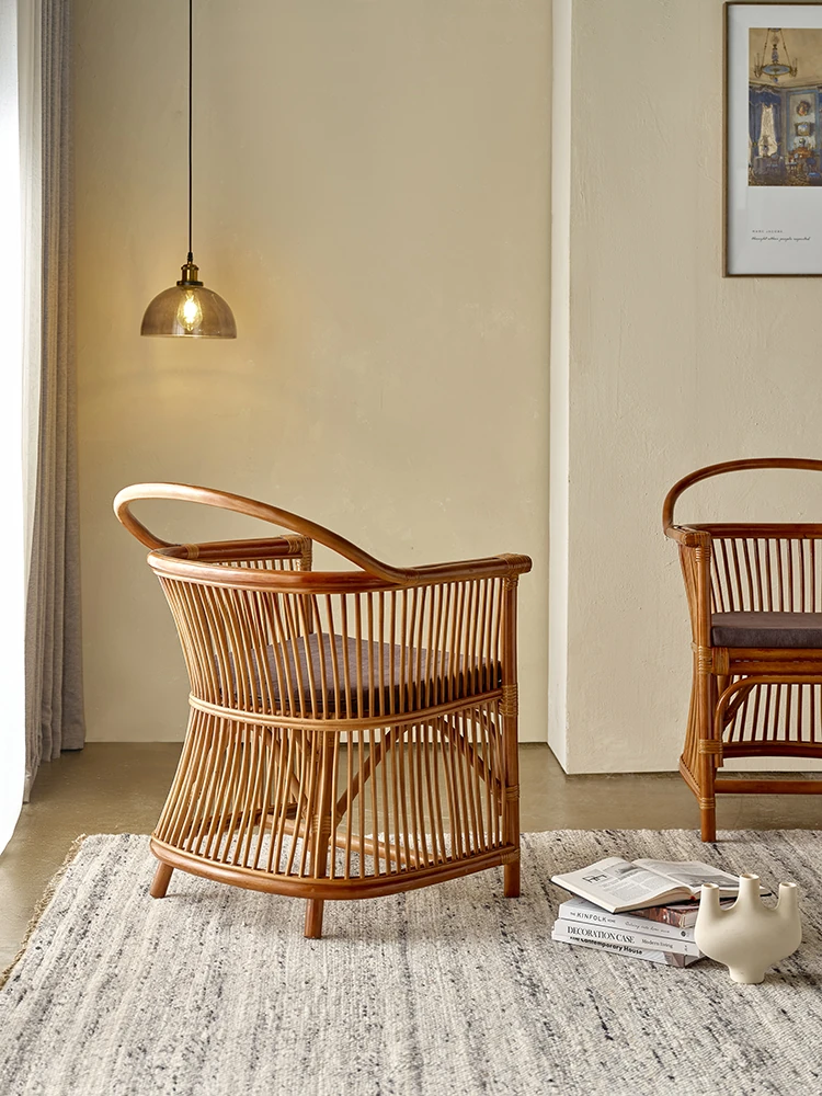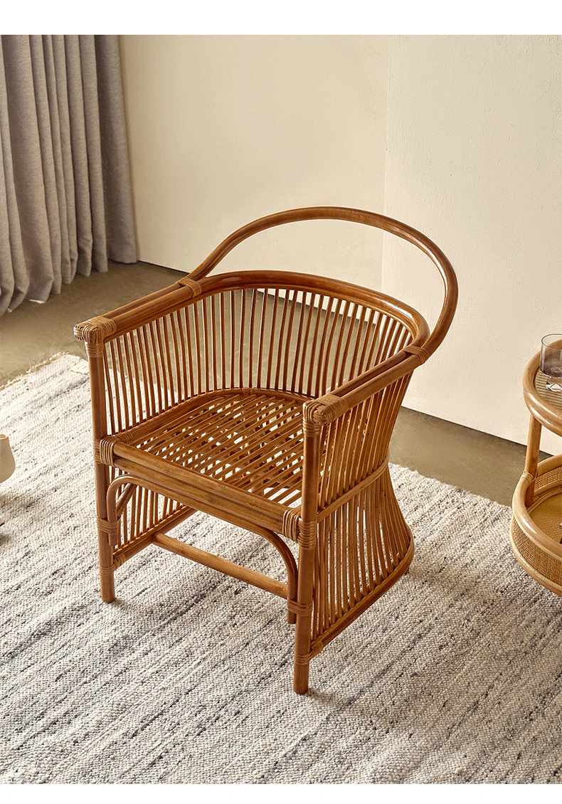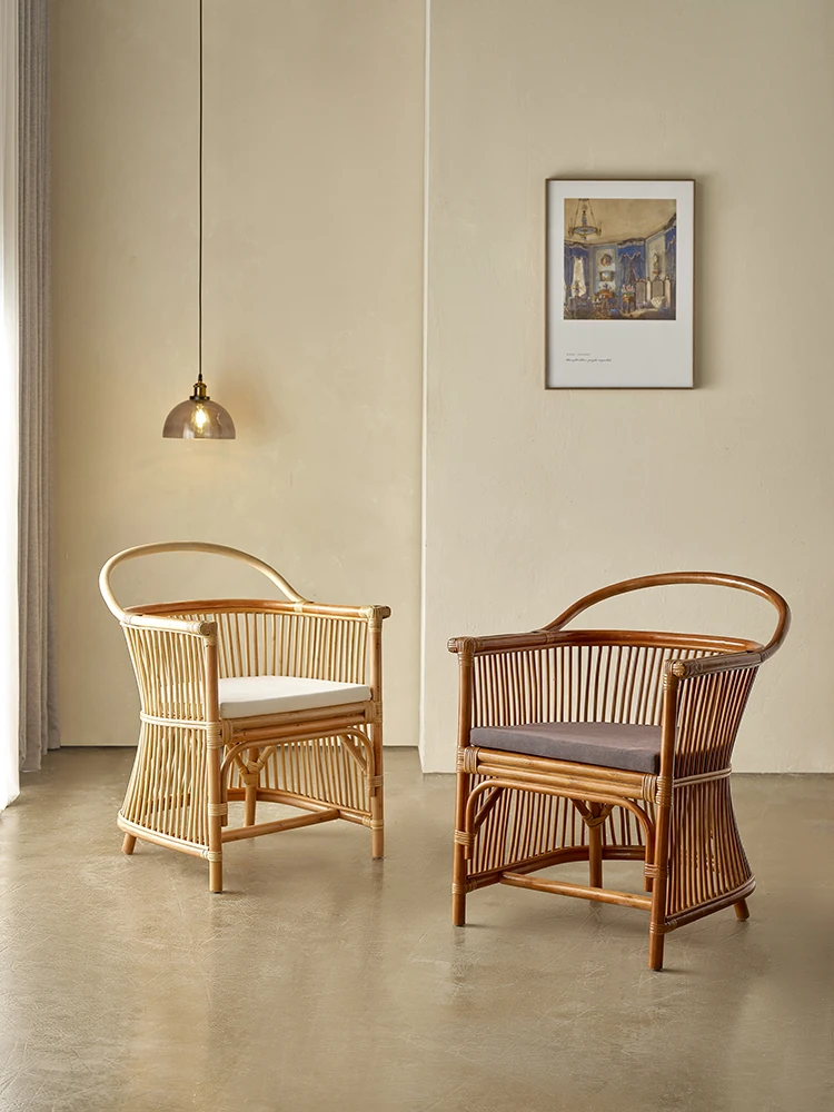 和風レトロなラタンチェア|侘び寂びスタイルの宿泊施設や茶屋に最適!天然素材を使用した手作りの本物のラタン製、背もたれとアームレスト付きで、心地よい座り心地を提供します。
