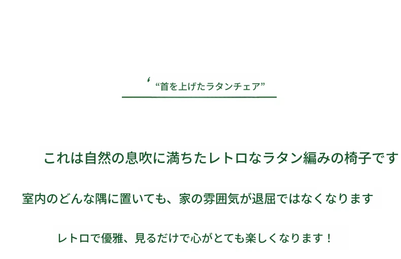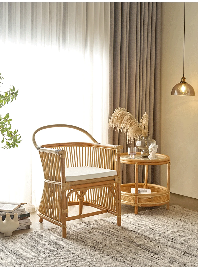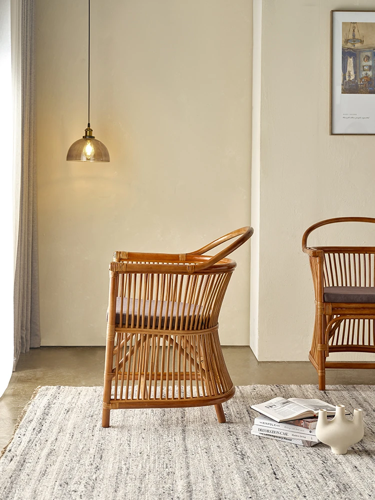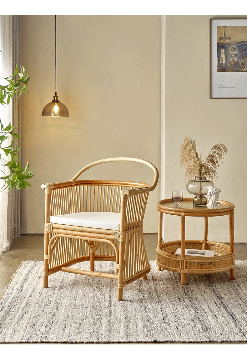 和風レトロなラタンチェア|侘び寂びスタイルの宿泊施設や茶屋に最適!天然素材を使用した手作りの本物のラタン製、背もたれとアームレスト付きで、心地よい座り心地を提供します。