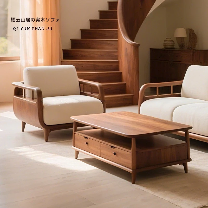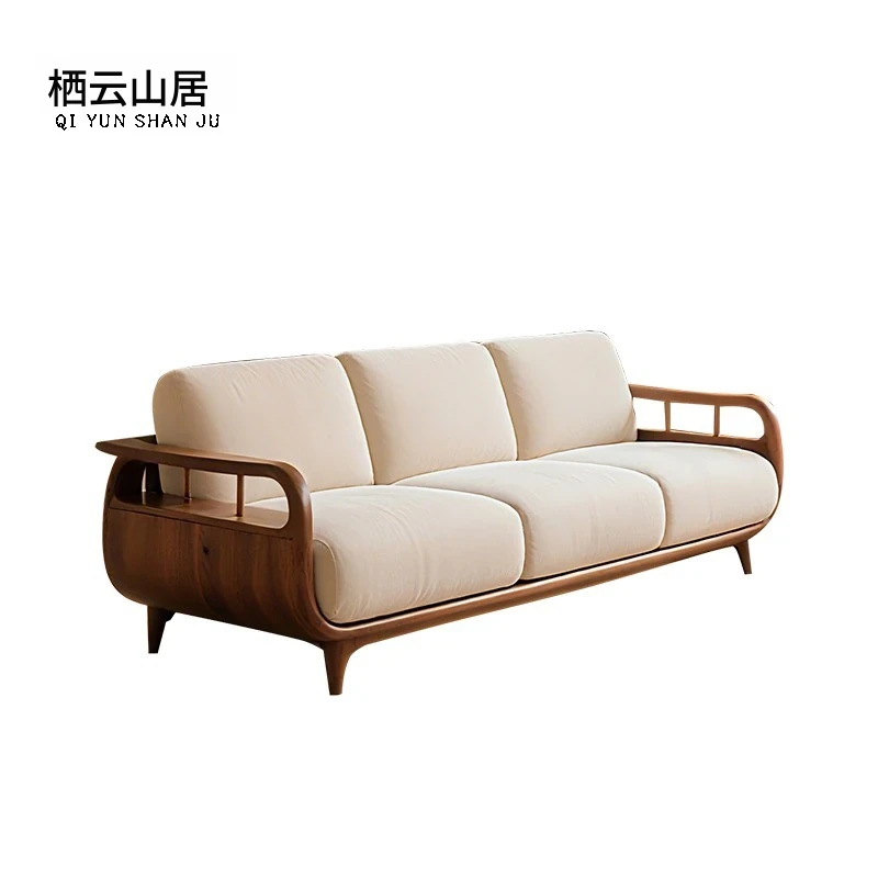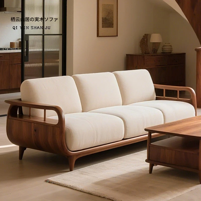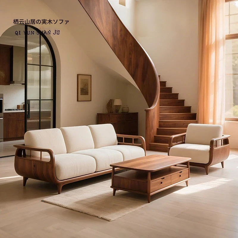 宋氏美学ソファ2025新作 中古風の無垢材による侘寂スタイル 三人掛けリビング直列コンビネーション 新しい中華スタイルで、洗練されたくつろぎ空間を演出します!
