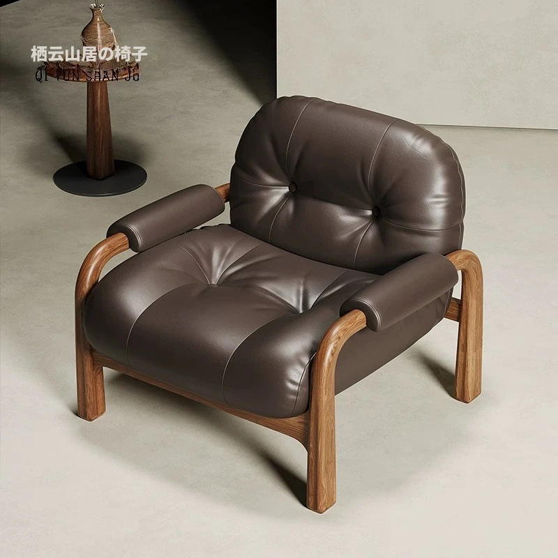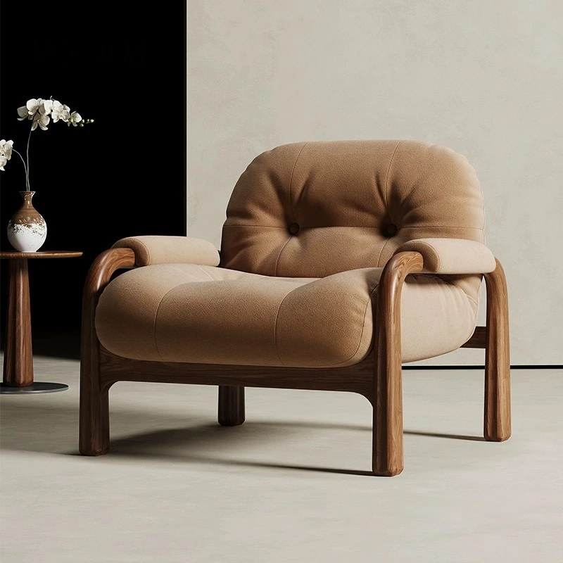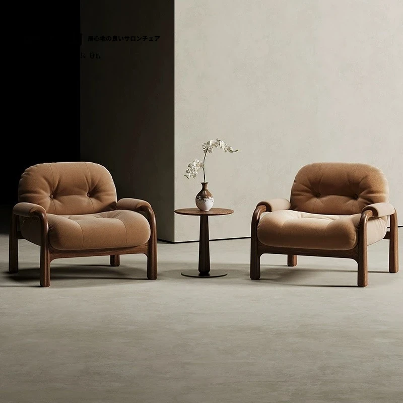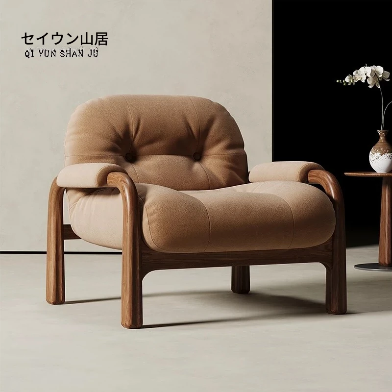 侘寂スタイルの無垢材シングルソファ|デザイナーによる胡桃の木製リラックスチェア|和の美しさを感じるユニークなデザインで、心地よい空間を演出します。